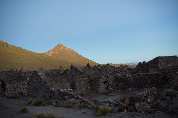 Am naechsten Morgen besichtigen wir noch vor Sonnenaufgang eine verlassene, spanische Siedlung. Silber hatte sie hierher gefuehrt. Fehlendes Silber und bittere Temperaturen wieder hinfort. Die bitteren Temperaturen lassen sich auf die Hoehe zurueckfuehren, denn kurz hinter der Siedlung passieren wir ...
