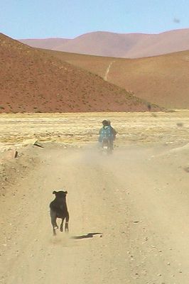 ... einen Hund, der wiederum ein Motorrad verfolgt. Fuer uns geht es weiter ...
