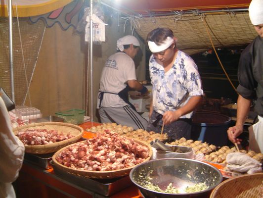 Neben den Unterhaltungsstaenden gab es natuerlich auch Fressbuden. Keiner hatte CPM :-( Stattdessen gab es kleine Tintenfische.