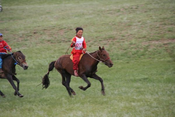 Schon auf dem Weg dorthin sehen wir Renntraining fuer das Naadamfest.