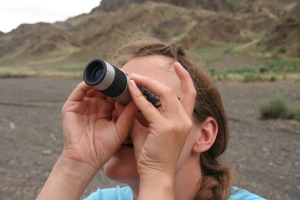 Auf den Huegeln sind Tiere zu sehen. Wohl Steinboecke. Mit dem Fernglas sieht man ein bisschen was.