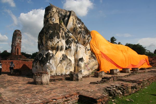 ... der liegende Buddha, der durch ein Feuer im Wat Lokayasutha nun unter freiem Himmel schlaeft.