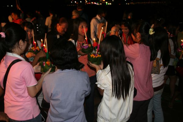 ... sich am 12.11. viele Menschen am Fluss versammeln um das Loi- -Krathong-Fest zu feiern, bei dem ....
