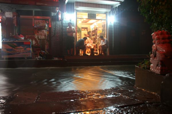 Damit es naechste Woche einen blauen Himmel gibt, lasst man momentan mit chemischer Unterstuetzung die Wolken jeden Abend abregnen. Was dann die Strasse an unserem Hostel in einen Fluss verwandelt. Die Go-Spieler stoert es nicht weiter.