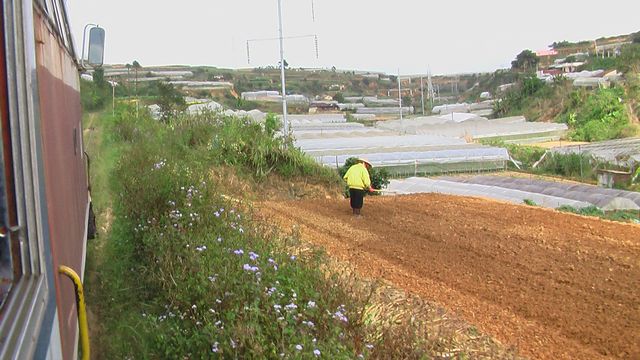 ... vorbei an einer Landschaft aus Feldern und Gewaechshaeusern ...